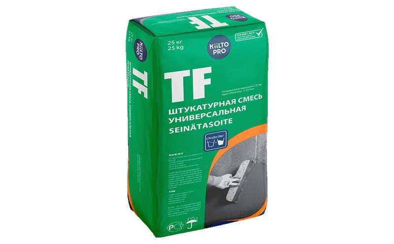 Штукатурка цементная универсальная KIILTO TF предназначена для выравнивания и ремонта стен из бетона, кирпича, газобетона. Готовую поверхность можно облицевать плитками, окрашивать фасадными красками или дополнительно обработать финишными шпатлевками или декоративными штукатурками.